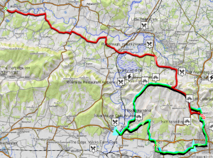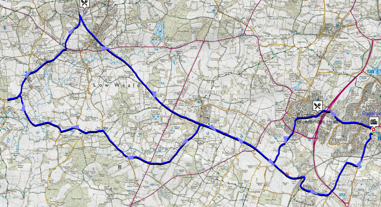 Across and alongside the A24 where Mr Budd, and subsequently the rest of the peloton, was harangued by a senior lady plus dog even though he had politely and diplomatically stated that he knew it wasn’t his right of way but wished to pass. She must have had some instinctive knowledge of his ways of dealing with dogs.