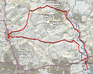 Across the A24 and up the steep climb towards the high barn, but with PT demonstrating how to accomplish a little lie down to a group of walkers whilst climbing the tricky gravel/rocky section. Another knee graze did not prevent him from continuing.