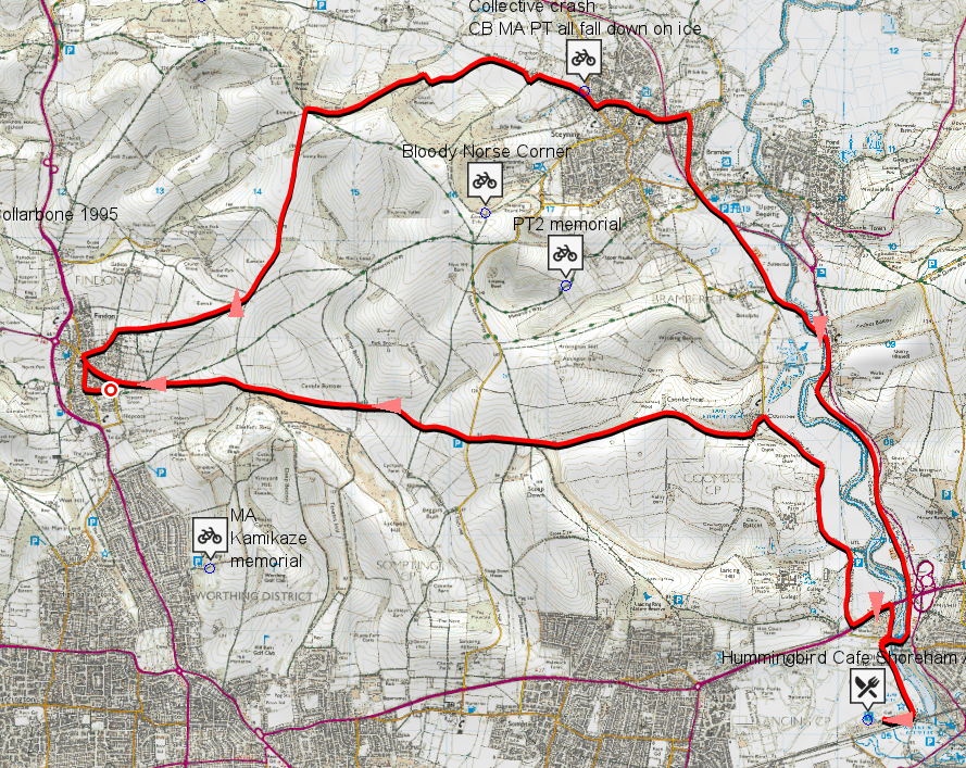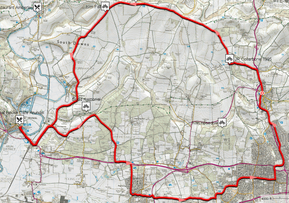 The e-three decided on Arundel, and informed Gentlemen of the visit to Erica’s by Whatsapp. The route went up through Muntham, along the SDW and down through Peppering Farm to Burpham.  Return leg via Warningcamp (or is it Lid?), up to APE, down to A27 and along it to Hammerpot, dropping Mark off and proceeding through the village (round the excavations) and over Highdown.  Mil Lane to, and then through, the Cemetery and finally home by the superhighway.  23.97 miles and 1546 feet