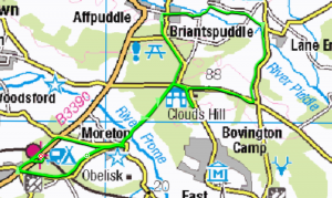 Returned to site (to ensure Margaret found her way back safely) before venturing back over Bovington Heath to Briantspuddle, Throop etc and thus back to site as shown on Strava. c.23 mls (c.8.5 + c.14.5)”His route is in green below:
