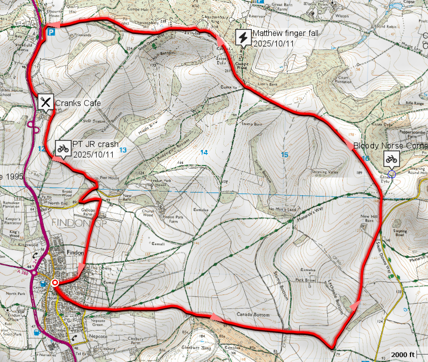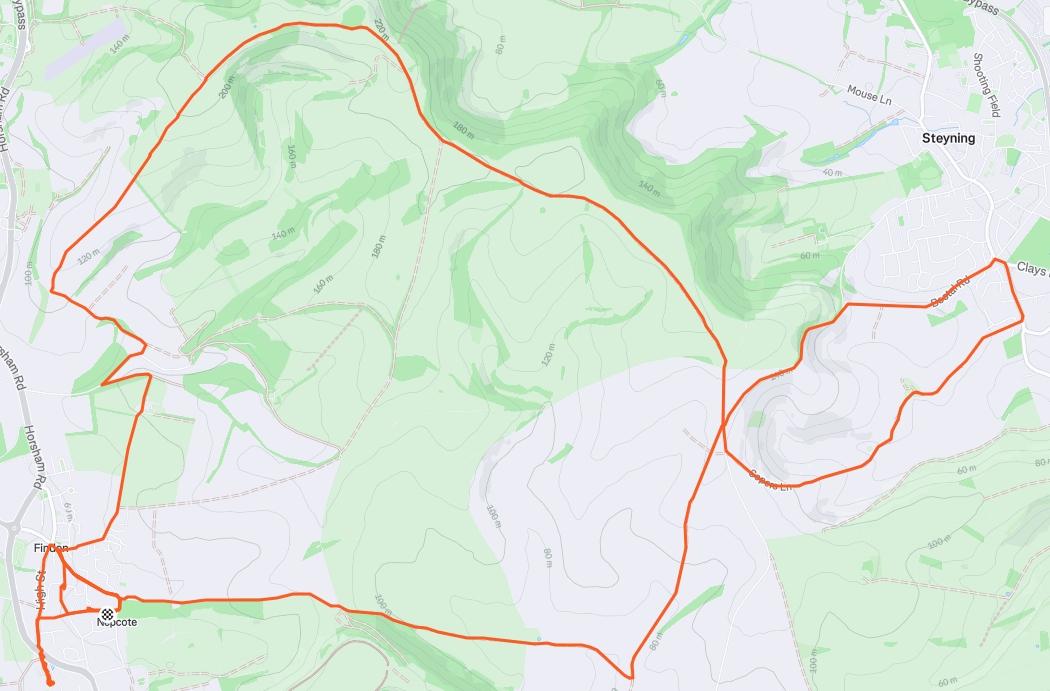 Ride started with a detour to Kersley Towers as he had forgotten his backpack. Back down into the village and up Stable Lane to Gallops Farm. Then onto the long climb up to Chanctonbury and over to Langmead. With plenty of time available we decided to do a loop down the concrete road to Steyning and back up the Bostal. At the top we headed south towards Lytchpole Farm and then the track to Cissbury car park, down Nepcote Lane, Steep Lane and to the Garden Centre to arrive on time where Mr Mead also arrived shortly afterwards.
