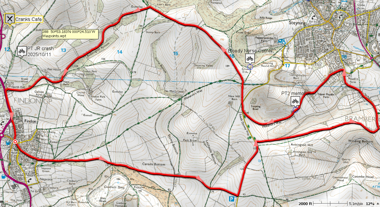 We set off up to the SDW via the crem and onwards to the high barn to join it, all a bit soggy due to the heavy recent rain. Onwards to Kithurst and then fork left at the top to head down towards Peppering Farm and the Burpham road. At Warningcamp we turned left and then right to get onto the old Arundel road and up to Crossbush. Then south along Lyminster road and over the new bridge. Continued south and then a wiggle through LA to the Harbour Lights to find Mr Mead waiting for our arrival.