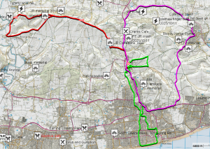Meanwhile JR (green) sallies forth down to the coast, and ZA (lavender) makes a road circuit round Steyning and Washington, timed to join in the brekking.