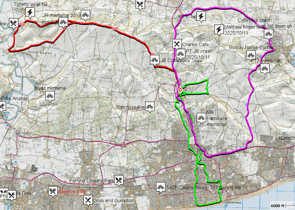 Post brek RT felt the need to burn some of it off (or maybe something to do with the presence of the sisterhood) and did a loop going up Cissbury, over to Lancing clump, Shoreham and the beach and returning to Worthing via the sea front. At Sea Lane cafe RT joined the sisterhood for a quick refreshment before returning to Findon via Durrington, High Salvington and the Bostal.