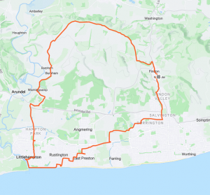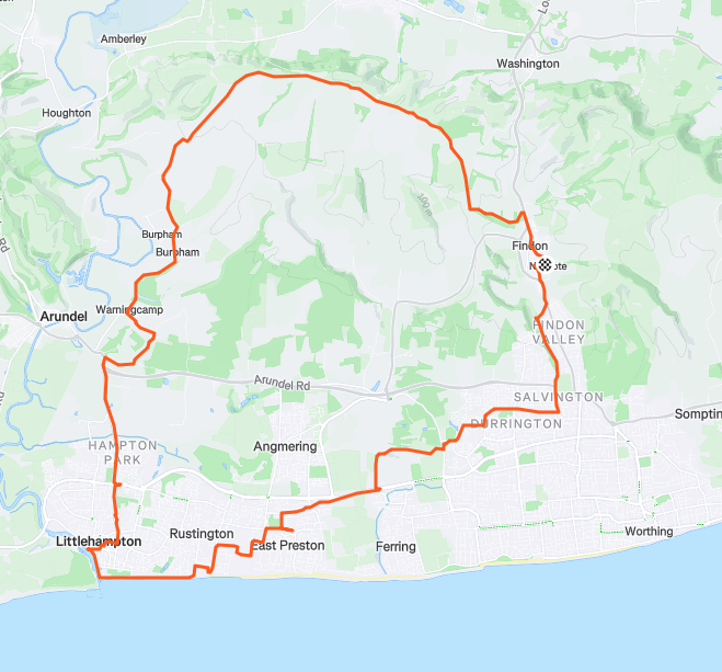 Return via the sea front through West Preston and to the A 259, with MA having parted company at Rustington and and a further parting of company at Hangleton Lane. At this point RK straight on the A259, past Tesco and up the valley to Findon, while the remaining peloton headed up Hangleton Lane and over Highdown ,on past Tesco and up Mill Lane and the Gallops home.