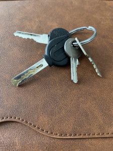 PT and JR met at OPG for a ceremonial handover of keys (not the famous Rover keys, but a smaller set lost on the Hadrians Wall ride). The keys had come to light when PT finally unpacked a bag of maps after that trip, so as to replace the maps in their correct places in the map drawer. For the occasion, PT attached the keys to a lanyard bearing the logo of Fulham Football Club. These keys will not be lost again.